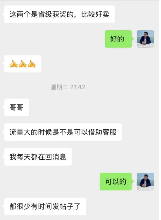 他说现在的流量很多,根本接不过来,每天就是各种回复,还问我有没有啥方法,我们这边提供客服不,帮他做点客服。对于客服,能自己做事最好的,自己发布的资料自己熟悉,实在不能做的也可以找我们。