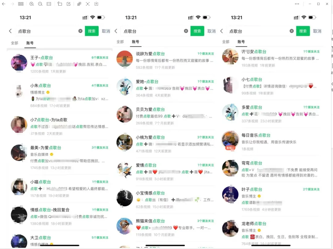 但是别人信这套,知道有这个需求,还搜索下,单独视频号就有无数账号做,模式全部一样,一样的内容制作,留下微信,别人找你传话。项目还是比较成熟的,没有多少难度,会唱歌更好。